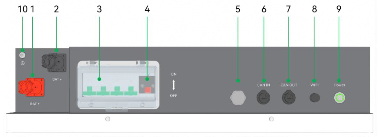 ⚠️ If you need to change the DIP switch position, you must turn off the battery first, including using the breaker switch (marked as part 3).