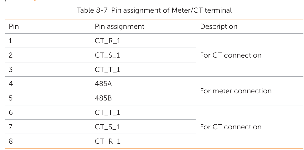 Thus, if you only intend to use a meter, you only need to connect two pins in the communication cable. For CT clamps, six pins are required. However, by connecting both CT clamps and the meter, you can create two separate measurement points.