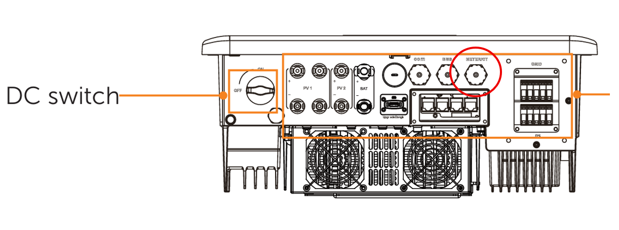 From the bottom view of the inverter, the connector highlighted in red is the one referred to in this article.