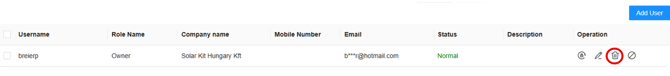 A felhasználó email címére vagy felhasználónevére rákeresve meg tudjuk keresni a profiljukat. Ekkor meg fog jelenni a felhasználó. - A képernyő jobb szélén található kuka ikonnal pedig ki tudjuk törölni a felhasználót, egy figyelmeztető üzenet leokézása után.